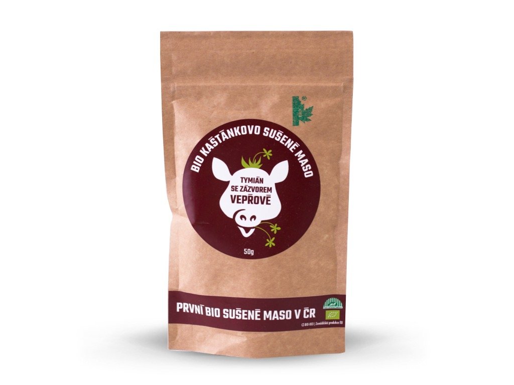 95,5% BIO vepřová kýta, 2% BIO zázvor, 1% BIO tymián, 1,5% sůl.