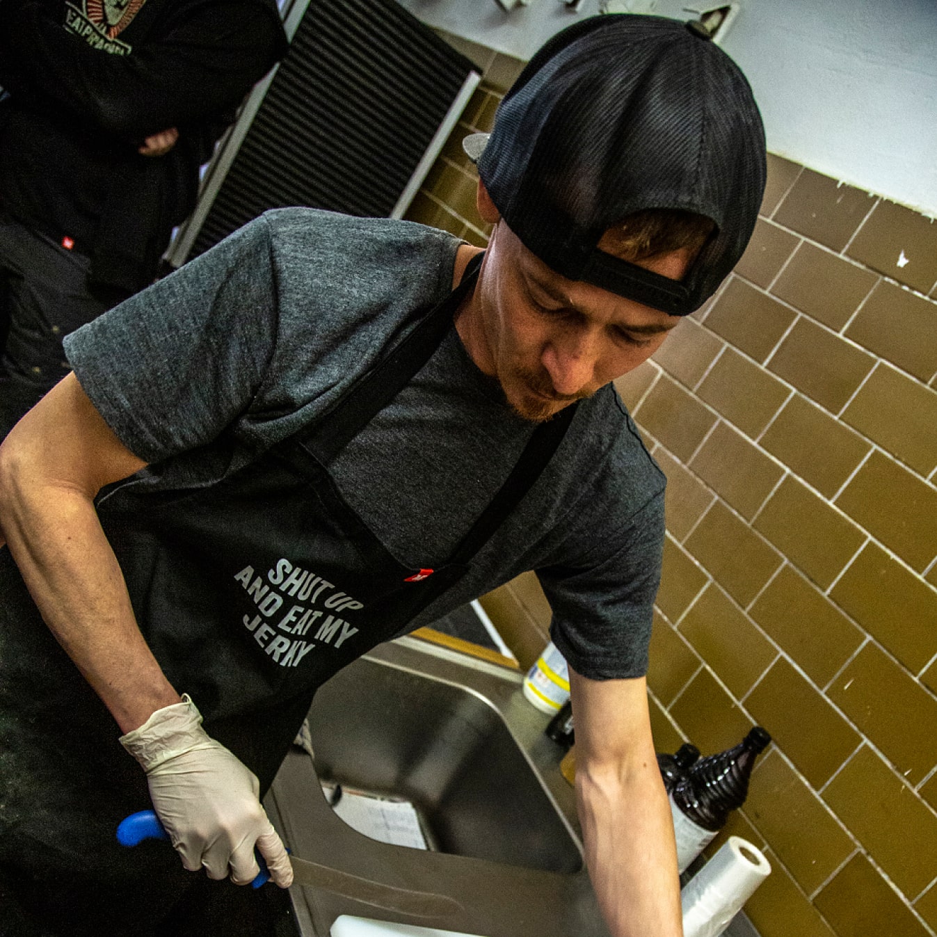 Mistr s nožem Jura se stal třetím členem týmu Maso Here po tom, co Ondra potřeboval pomoc s výrobou. Jeho zkušenosti s krájením masa bylo přesně to, co jsme potřebovali. Jura má dnes na starosti výrobu biltongu od A až do Z. Maso nakrájí, okořenění, naloží, suší a pak seká. Jeho láska k řeznickému řemeslu jde poznat na každém kousku masa. Jurův favorit v naší nabídce je Kešu & Biltong.