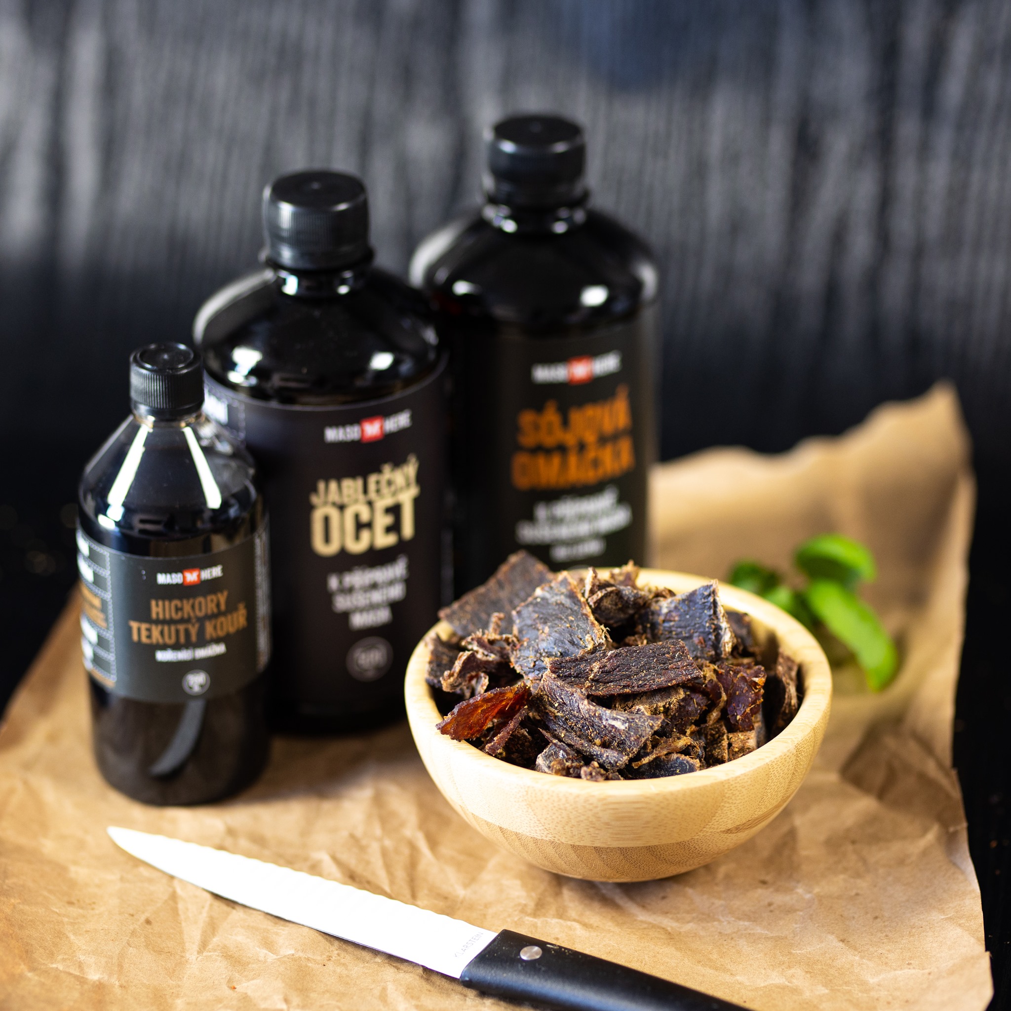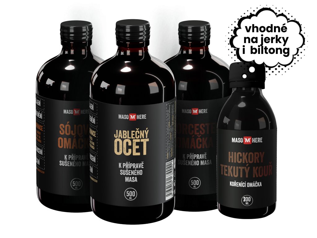 Při výrobě sušeného masa není ocet jako ocet. To samé platí o sojovce nebo worcesteru. Když budeš na našem webu číst o receptech na jerky nebo biltong, tak najdeš tyto ingredience skoro v každém z nich. Aby ti tedy všechno hrálo podle našich not, tak doporučujeme použít naše produkty. Známe jejich sílu a přesné dávkování.