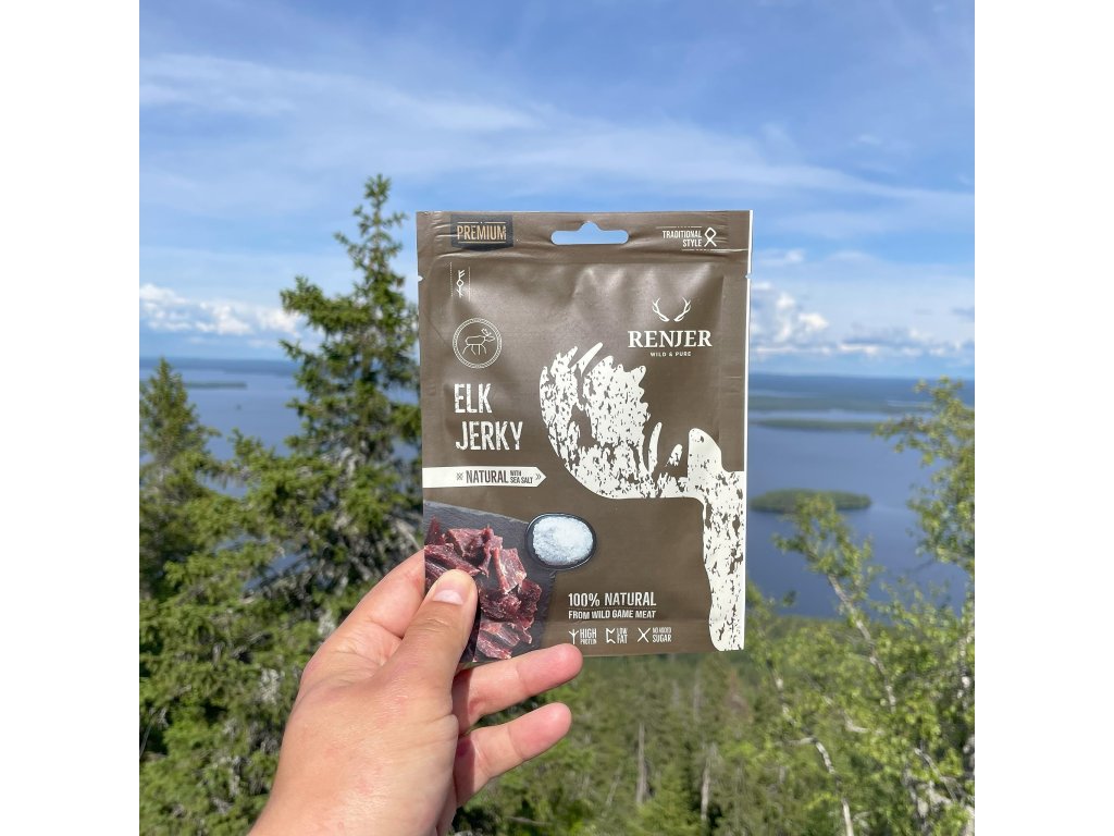 Tohle není klasika. Losí jerky od Renjeru jsou jemně sušené, tenčí plátky masa s přirozenou chutí zvěřiny a decentní mořskou solí. Méně šťavnaté než naše biltongy, ale o to víc autentické. Malé kousky, které ti dají nahlédnout do chuti severu – divoké, přírodní, prostě jiné než cokoliv, co jsi zatím zkusil.